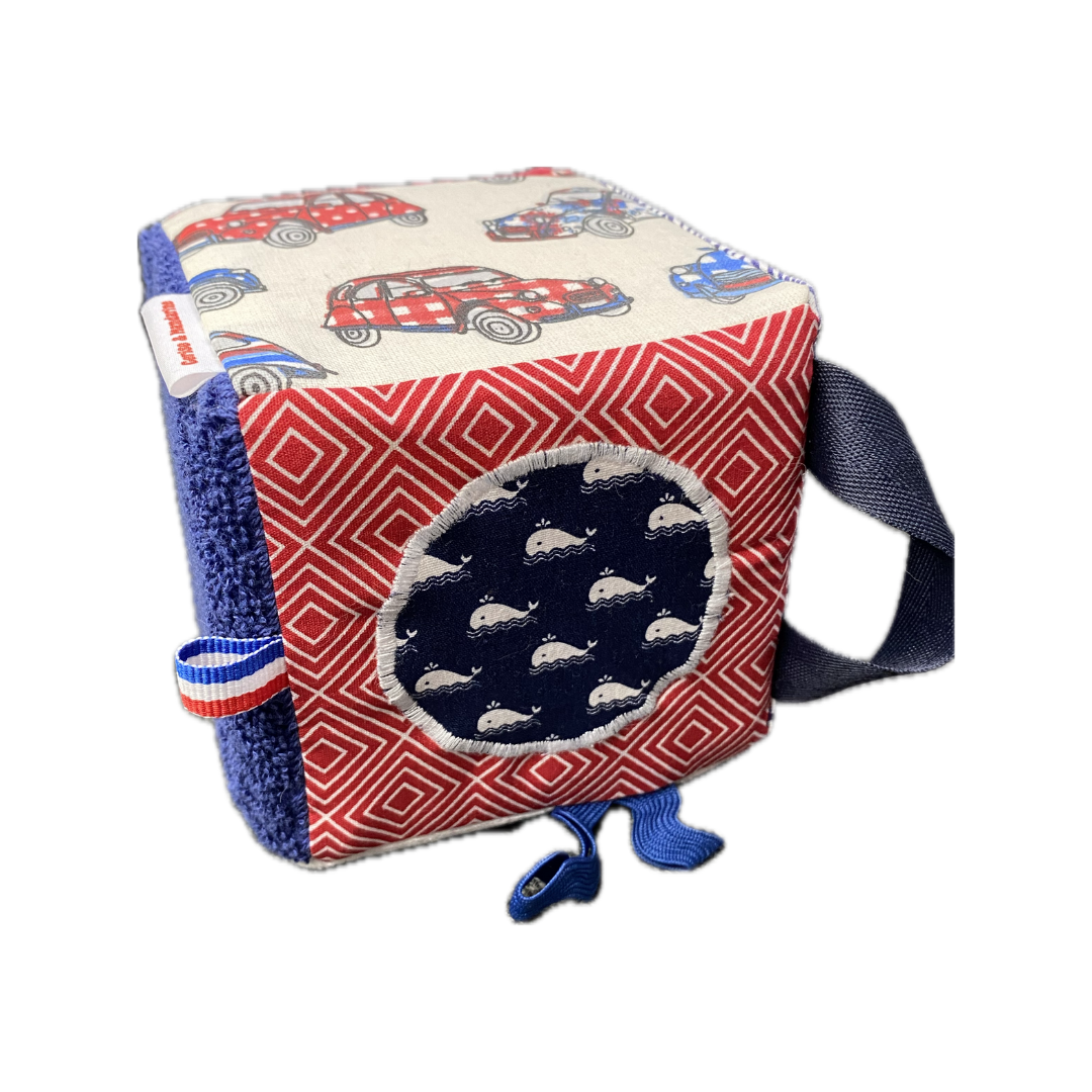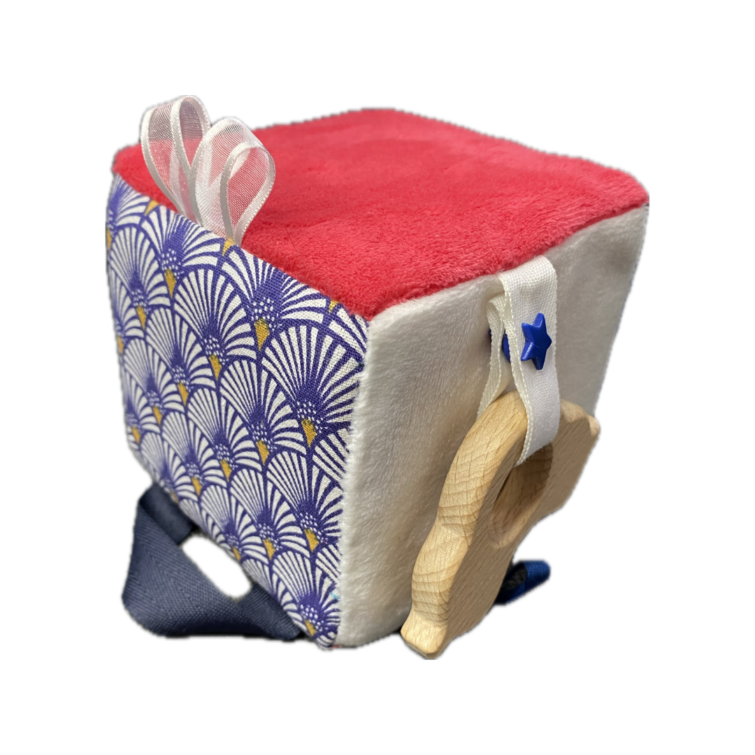 Jouet d'éveil idéal, ce cube est utilisable dès 6 mois. L'enfant peut développer son sens du toucher par les différentes textures de tissu (éponge, velours, enduit, coton...) ; il travaille sa motricité fine en attrapant les petites étiquettes ; soulage ses dents sur l'anneau en bois naturel.