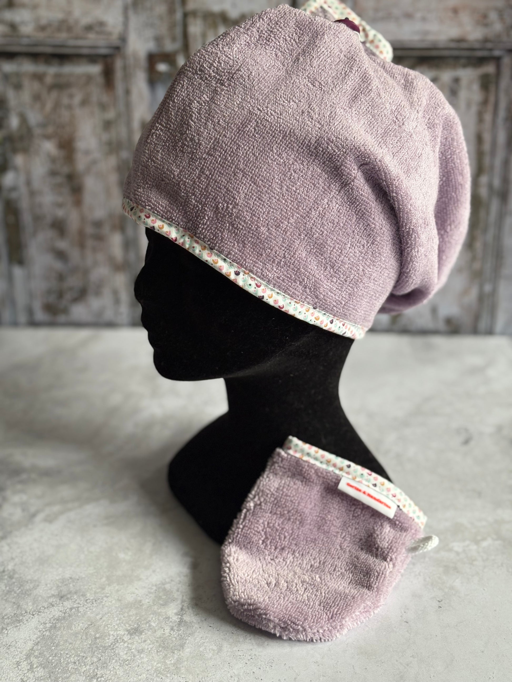 Ensemble assorti composé d'une serviette à cheveux et un gant démaquillant. A emporter en vacances, à la piscine ou simplement à utiliser dans votre salle de bain.